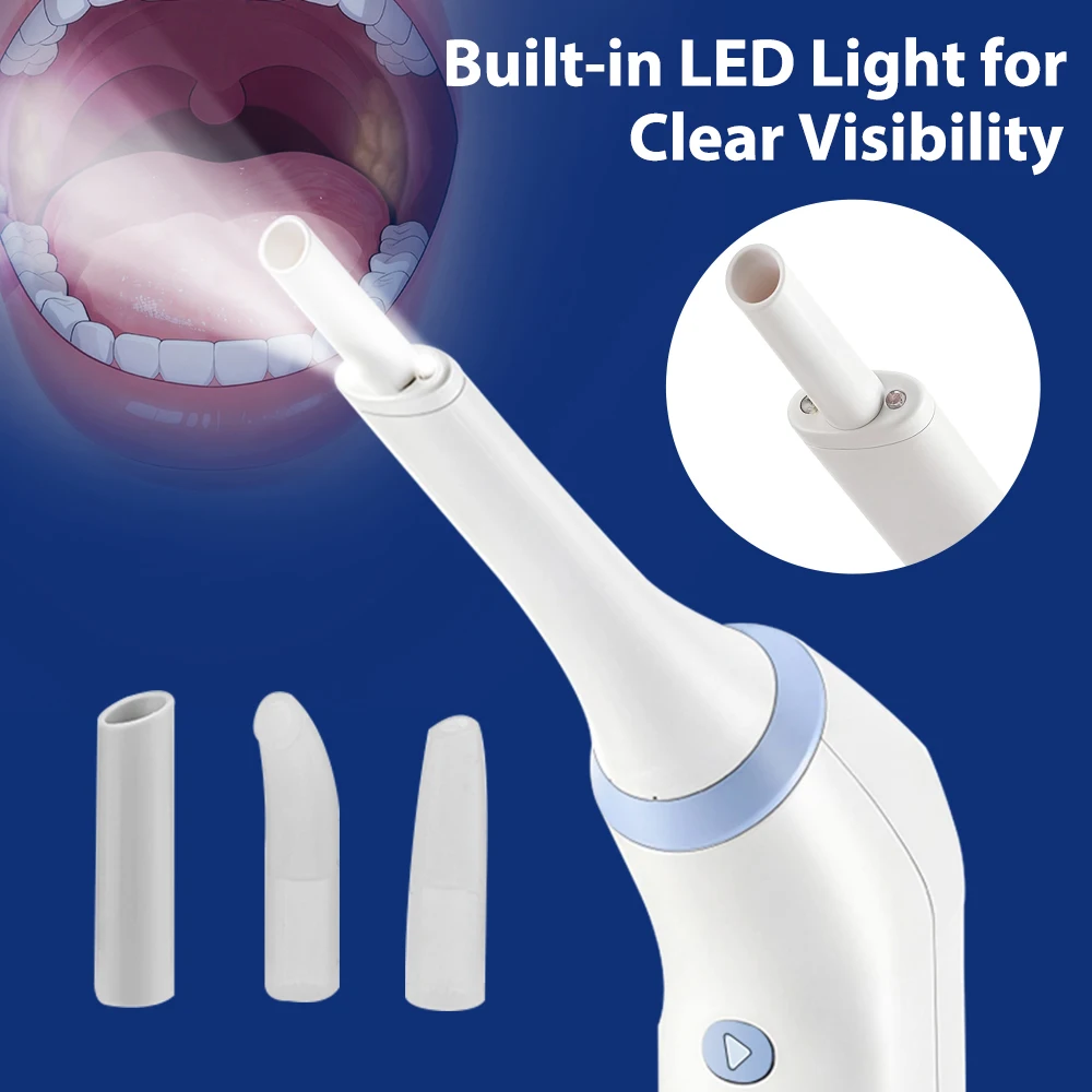 4.مزود بضوء LED مدمج يضيء تجويف الفم أثناء التشغيل.يضمن رؤية واضحة لتحديد الموقع بدقة واستخدام آمن، مما يعزز بشكل كبير فعالية التنظيف والسلامة.